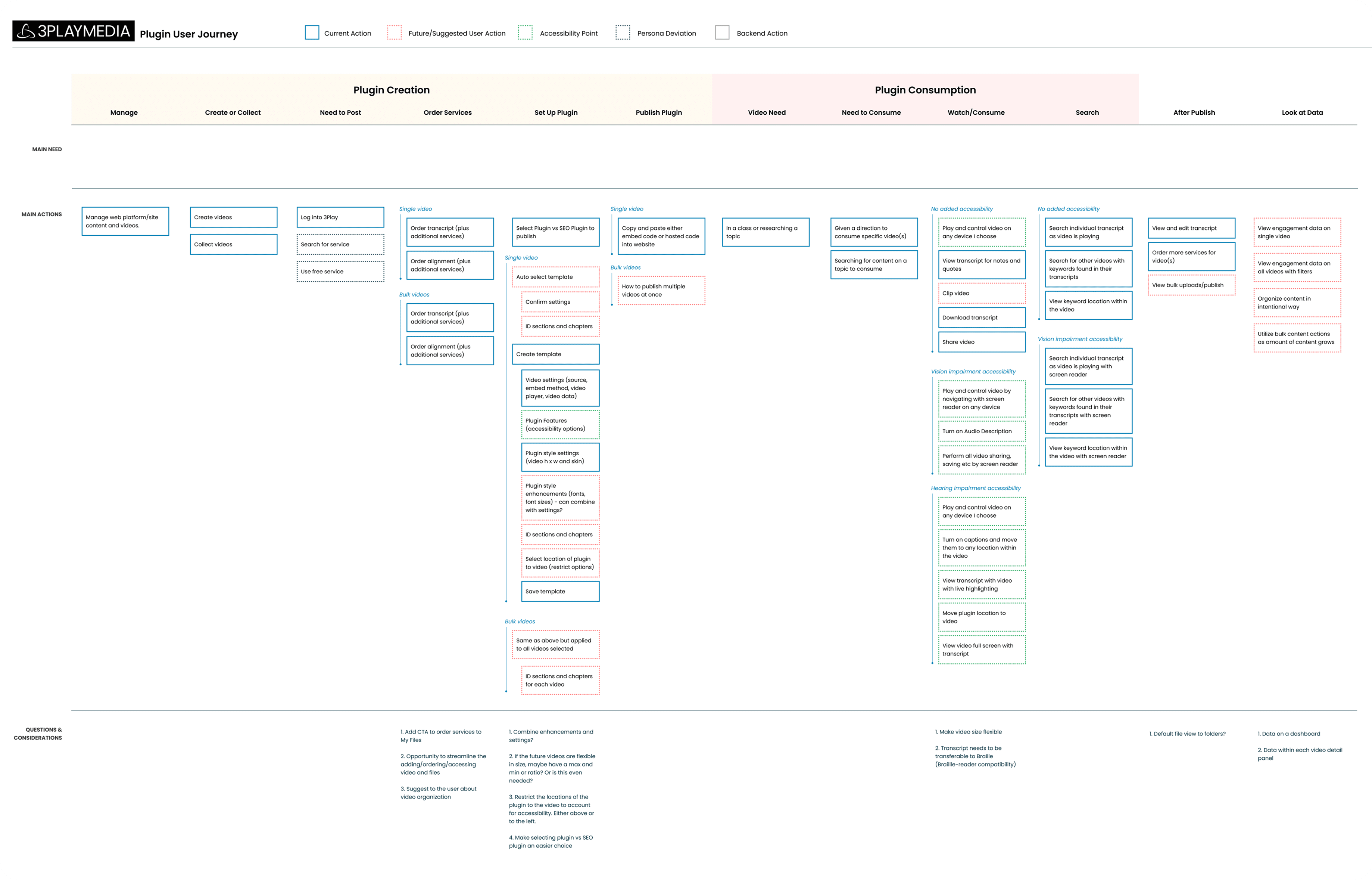 One of the first steps was creating a user journey map, auditing the current process, future user actions, accessibility pain points, and back-end requirements. It also highlighted where variations might occur based on individual personas.