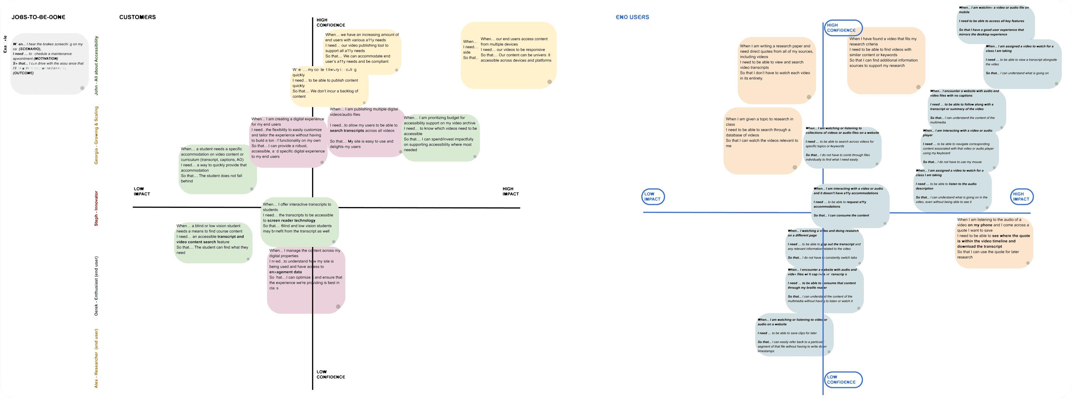 From 144 customer needs, I mapped jobs to be done based on impact and confidence for customer and end user personas to help prioritize key initiatives.